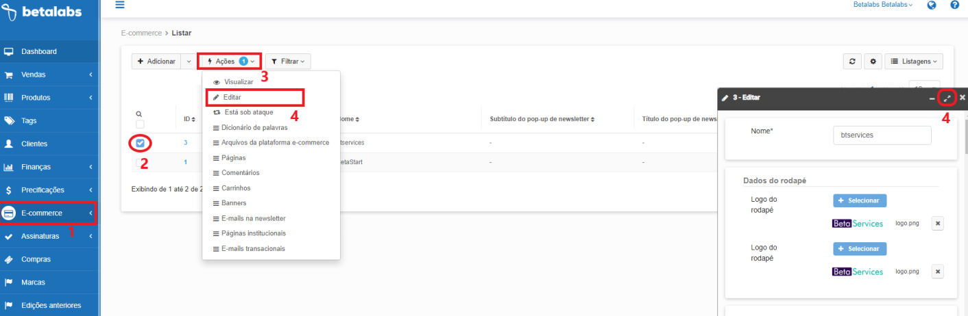 Para iniciar a configuração é necessário entrar na Aba “E-commerce” dentro do seu painel Betalabs e seguir o seguinte fluxo: Selecione a loja no checkbox e clique no campo “Ações” e logo aparecerá diversas funções, mas de começo o ideal é começar pelas configurações iniciais da loja e entrar em "Editar" logo aparecerá a janela para editar as informações:
