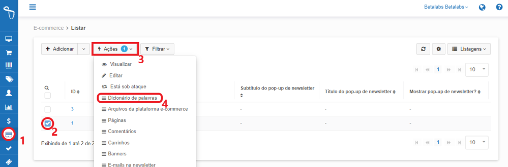 Para iniciar a configuração é necessário entrar na Aba “E-commerce” dentro do seu painel Betalabs e seguir o seguinte fluxo: Selecione a loja no checkbox e clique no campo “Ações” e logo aparecerá diversas funções, mas de começo o ideal é começar pelas configurações iniciais da loja e entrar em "Editar" logo aparecerá a janela para editar as informações: