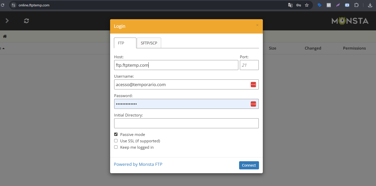 Acesso link http://online.ftptemp.com/ e inclua os acessos disponibilizados pela equipe de implantação e suporte.